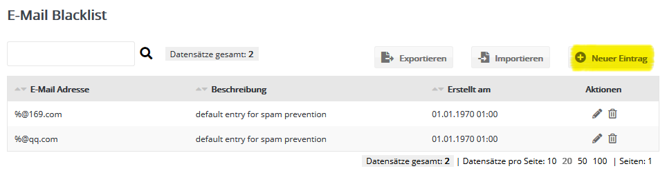 Sie haben die Möglichkeit, E-Mail-Adressen aus einer CSV-Datei in die Blacklist zu 'importieren'.