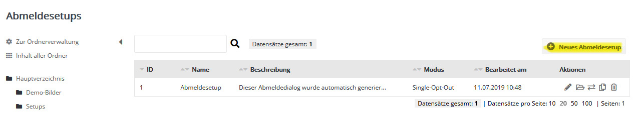 Ablauf einer AbmeldungKlickt der Empfänger den Abmeldelink an, wird ein in MAILINGWORK eingerichtetes 'Abmeldesetup' angestoßen und der Abonnent vom Newsletter-Empfang abgemeldet. Das kann je nach Einstellung entweder sofort oder nach nochmaliger Bestätigung (Double-Opt-Out, nicht empfehlenswert) passieren. In den Eigenschaften eines Abmeldesetups wählen Sie die Bestätigungsnachricht aus und optional die Abonnentenlisten, aus denen der Abonnent entfernt werden soll. Ist der Abonnent aufgrund der Abmeldung in keiner einzigen Abonnentenliste mehr enthalten, wird er auch aus der 'Abonnentenverwaltung' entfernt. Neues Abmeldesetup erstellen |