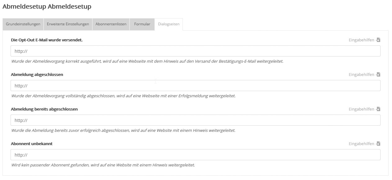 Zur Erklärung: Ein Abonnent wird nach erfolgreicher beziehungsweise fehlerhafter Eingabe seiner Daten zu einer entsprechenden Antwort-Seite geleitet, um zum Beispiel die Meldung 'Ihre Anmeldung war erfolgreich' zu erhalten. Füllen Sie diese Felder nicht aus, werden Standard-Seiten von MAILINGWORK verwendet. Möchten Sie aber eigene Seiten anzeigen lassen, geben Sie die URLs Ihrer Webseiten in den Feldern an. Alternativ bietet Kapelan Medien GmbH die Erstellung von Dialogseiten auf Basis Ihres Corporate Designs an. |